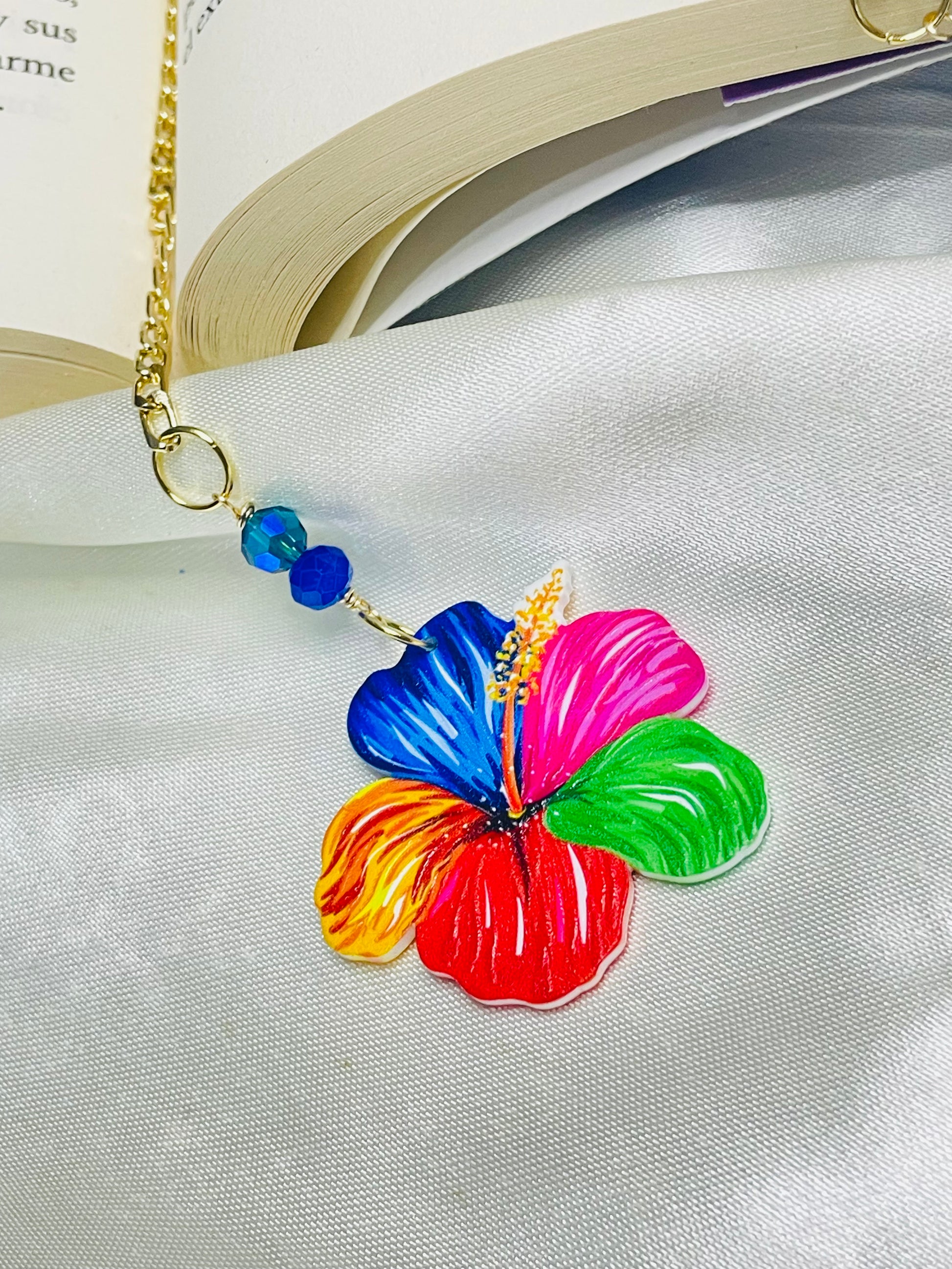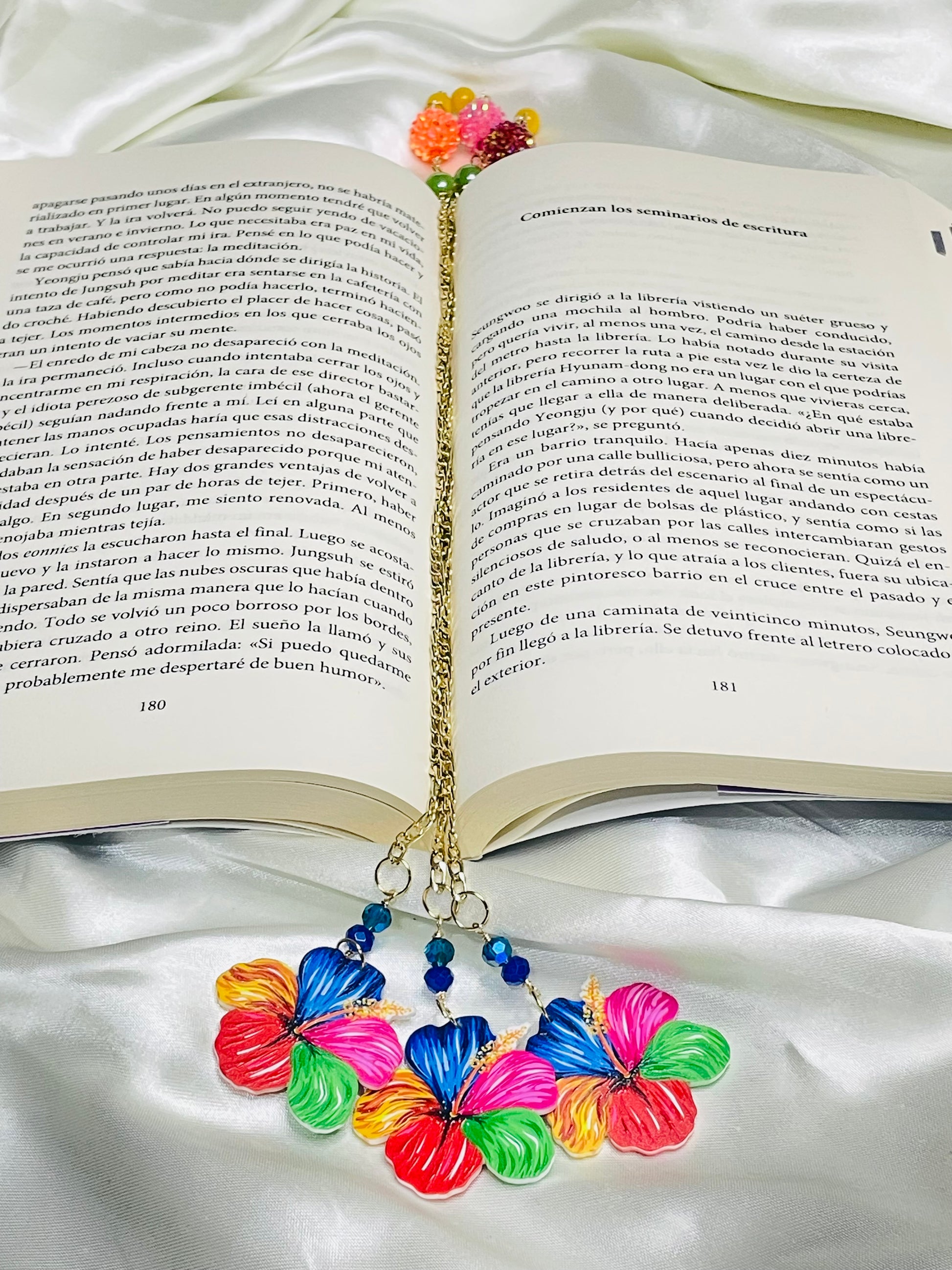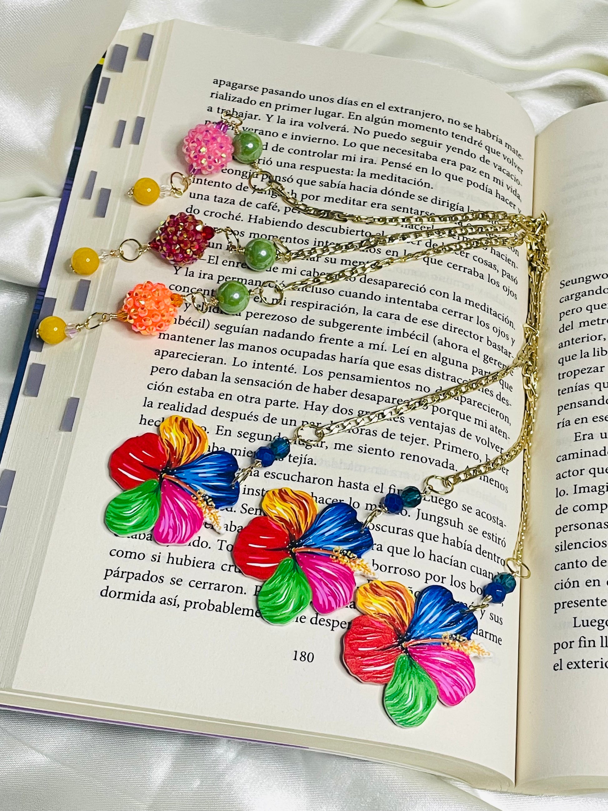 Nuestros marcadores de flor de maga, símbolo nacional de Puerto Rico, están hechos a mano con detalles vibrantes y coloridos que evocan la alegría de nuestra isla. Cada uno está confeccionado con una flor llamativa de resina, acompañada de cuentas decorativas y una delicada cadena dorada, perfecta para resaltar entre las páginas de tus libros favoritos.