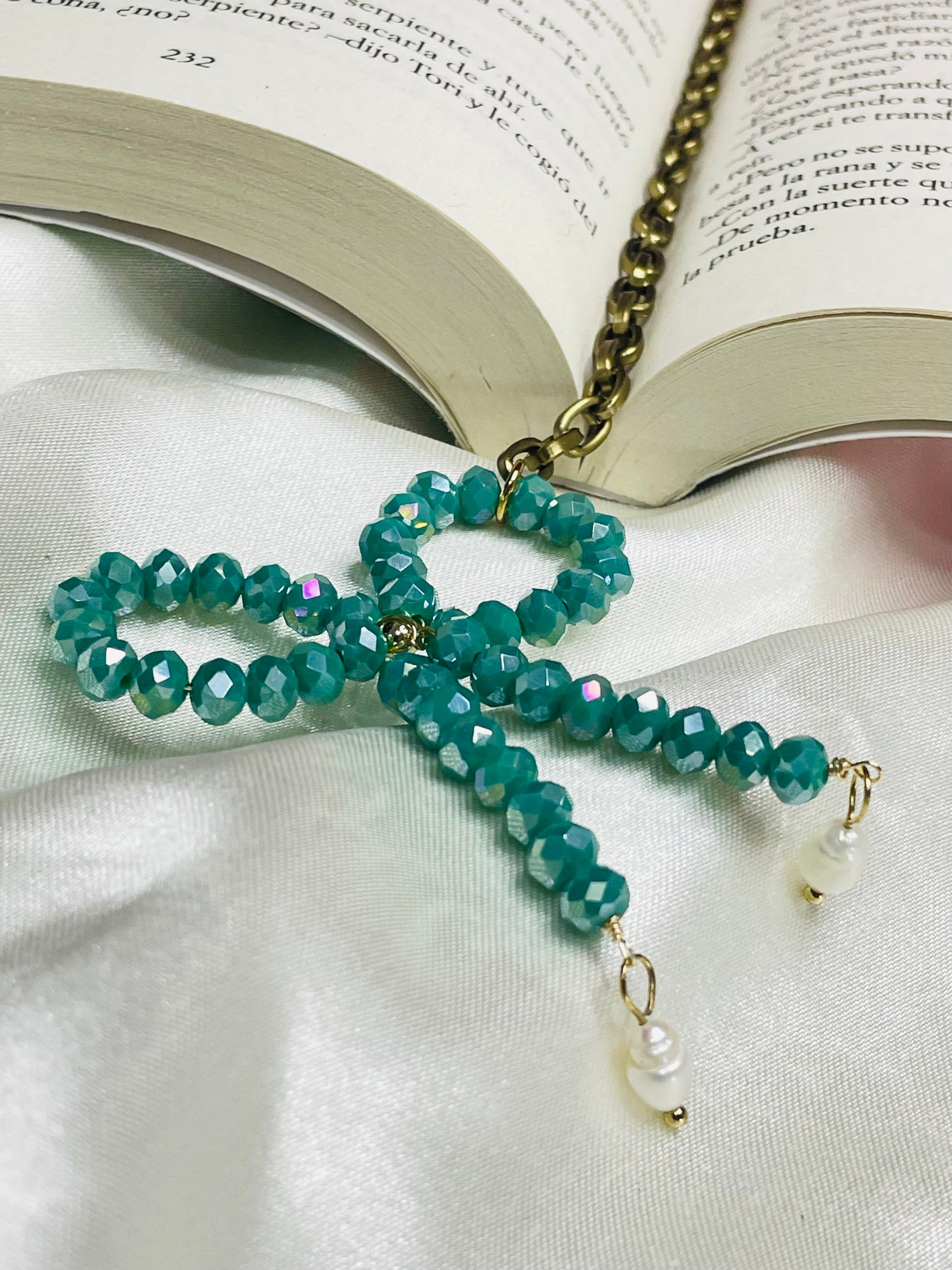 Cuenta con una cadena de aluminio en tono bronce de 10 pulgadas, ideal para adaptarse a distintos tamaños de libros. En las puntas del lazo, incluye perlas de agua dulce, aportando un acabado fino y romántico que complementa perfectamente la pieza.